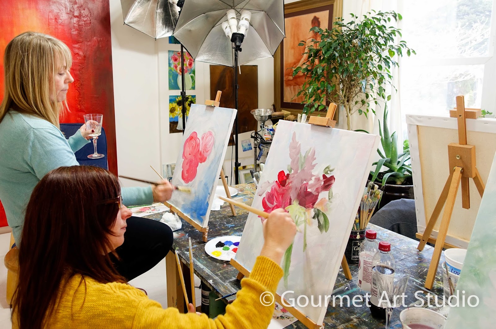 Hosted in my studio, I guide the session and offer a helping hand. It is a lot different experience from the over-sized commercial painting parties. The atmosphere is unpretentious and welcoming so that you can relax, have fun, chat with your friends or make new ones. Create memories at Gourmet Art Studio, for a girls night out, date night, birthday/ anniversary celebration, family night out or any special occasion or a private party. You may choose from one of my prints, to use as a guideline, as you create your painting or choose something of your own to create.